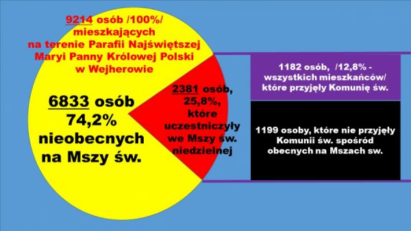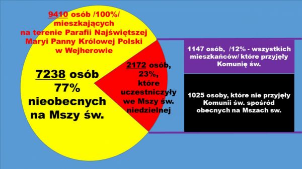 W powyższym badaniu nieznaną jest liczba osób, które były na Mszy św. a nie są z naszej parafii oraz ilu z naszych parafian uczestniczyło we Mszy św. w innej parafii. Tego nie wiemy. Mimo rzetelności, z która ministranci i lektorzy oraz księża i szafarze liczyli wiernych nie sposób nie popelnić błędów, ale ich skala również jest nieznana. Zauważalny jest mały wzrost wiernych uczęszczających do kościoła na Mszę św. w odniesieniu do zeszłego roku, chociaż frekwencja osiągnęła blisko 27%, jest to liczba, która pozostawia jednak wiele do życzenia.