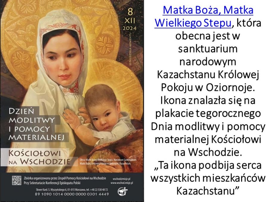 Dzisiaj XXV Dzień modlitwy i pomocy materialnej Kościołowi na Wschodzie. Ofiary zebrane służą pomocą katolikom we wszystkich diecezjach w krajach Europy szczególnie w tym roku Kazachstanu, gdzie liczba katolików to ok. 200 tys. osób w tym około 30 tyś. Polaków, dzieci zesłańców. Na plakacie zamieszczonym na stronie internetowej jest Mata Boże Wielkiego Stepu. Ofiary można składać do Skarbony przy obrazie Matki Bożej. Bóg zapłać za wsparcie.