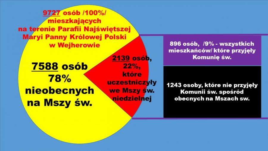 Zgodnie z uchwałą Konferencji Episkopatu Polski w tym roku doroczne badanie niedzielnych praktyk religijnych, czyli liczenie katolików zobowiązanych do uczestniczenia w mszy św. i przystępujących do komunii św., odbyło się 26 września br. we wszystkich parafiach kraju. Wg liczenia wiernych w naszej parafii w tę niedzielę było na Mszach św. 2139 osób, spośród któych 896 osób przystąpiło do Komunii św. Na ogólną liczbę osób mieszkajacych w naszej parafii, wierzących i niewierzących, którą podaje Urząd Skarbowy i któa wynosi 9727 osób, procentowo ta obecnosć ksztąłtuje się na poziomie 22% , jeżeli chodzi o uczestnictwo we Mszy św. a zaledwie 9%, jeżeli chodzi o przyjęcie Komunii św. Jeżeli chodzi o mężczyzn i kobiety to we Mszach św uczestniczło 1346 kobiet i 793 mężczyzn. Komunię święta przyjęło 599 kobiet i 298 mężczyzn.'