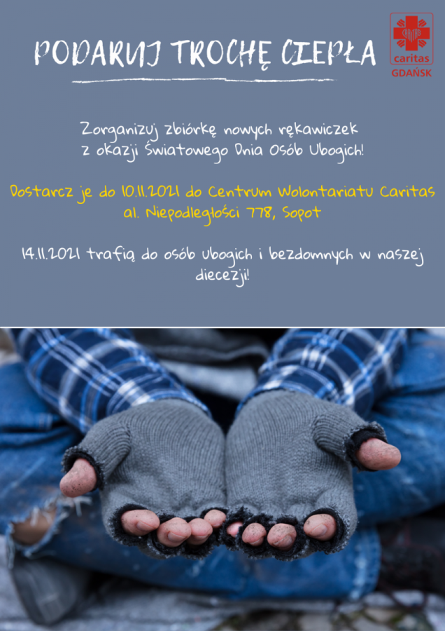 Nasza parafialna CARITAS we współpracy z CARITAS Diecezjalną zaprasza wszystkich chcących nieść pomoc do akcji: „Podaruj trochę ciepła”. Polega ona na pomocy osobom bezdomnym i najbardziej potrzebującym poprzez wręczenie im rękawiczek i skarpet.