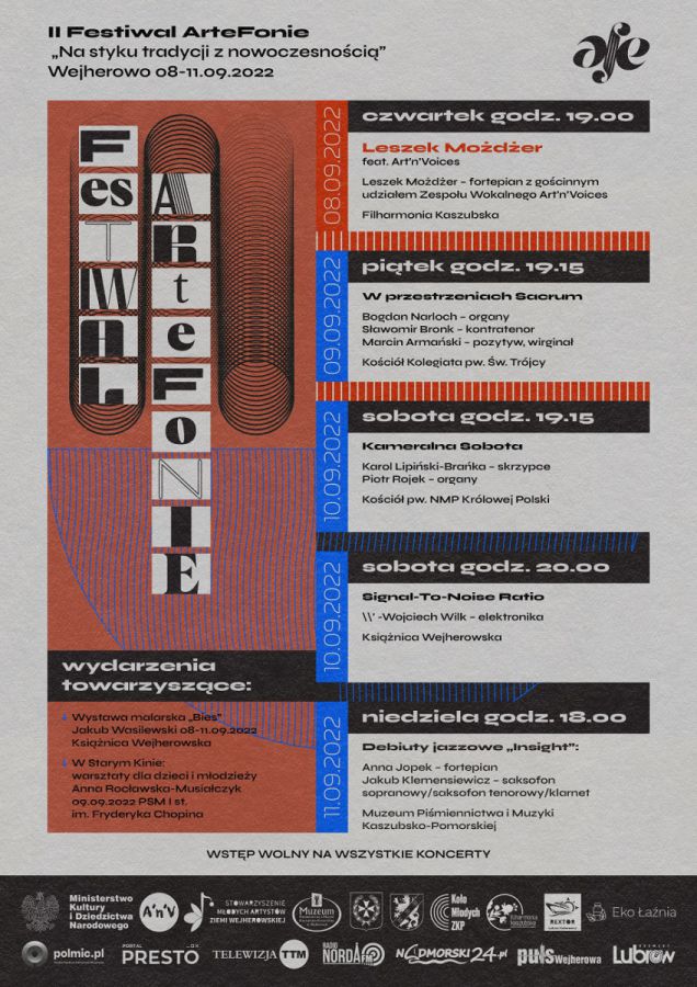 W dniach od 08-11 września bieżącego roku odbywać się będzie w Wejherowie II Festiwal ArteFonie, łączący różne style i gatunki muzyczne, od muzyki dawnej, kameralnej po jazzową i elektroniczną. Jeden z koncertów festiwalowych odbywać się będzie w naszym kościele, w sobotę 10. września o godz. 19.15. Wystąpią Karol Lipiński-Brańka - skrzypce oraz Piotr Rojek - organy. Dodatkowo koncert będzie wsparty projekcją wizualną. Szczegóły na plakatach. Wstęp wolny. Serdecznie zapraszamy!