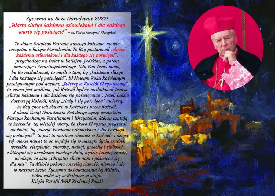 Z okazji Świąt Narodzenia Pańskiego życzę wszystkim Naszym Kochanym Parafianom i Wszystkim, którzy czytają te życzenia, tej wielkiej wiary, że skoro Chrystus przyszedł na świat, by „służyć każdemu człowiekowi i dla każdego się poświęcić”, to jest to możliwe również w Kościele i dzięki tej wierze nawet to co wydaje się w naszym życiu trudne: wszelkie cierpienia, choroby, nałogi, grzechy i słabości, z którymi się borykamy każdego dnia, będzie łatwiej znosić, wiedząc, że sam „Chrystus służy nam i poświęca się dla nas”. Ta Miłość pokona wszelką słabość, niemoc i zło w naszym życiu. Życzymy doświadczenia tej Miłości, która rodzi się w Betlejem, w stajni.