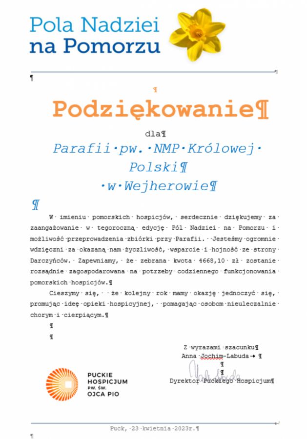 Otrzymaliśmy podsumowanie zbiórki w naszej parafii akcji "Pola Nadziei - Hoscpicjum to życie". Bóg zapłać Naszym Parafianom za wsparcie :)