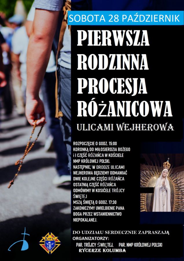 W najbliższą sobotę 28 października wyruszy z naszej parafii do Wejherowskiej Fary, Pierwsza Rodzinna Procesja Różańcowa. Będzie ona również przygotowaniem do Uroczystości Wszystkich Świętych w ramach „Holy Wins”. O godz. 15.00 Koronka do Miłosierdzia Bożego i I część Różańca w kościele, następnie, w drodze będziemy odmawiać kolejne części i w Farze ostatnia część różańca. Msza Święta o 17.30 zakończy nasze uwielbienie Pana Boga przez Wstawiennictwo Niepokalanej. Serdecznie zapraszamy do udziału.