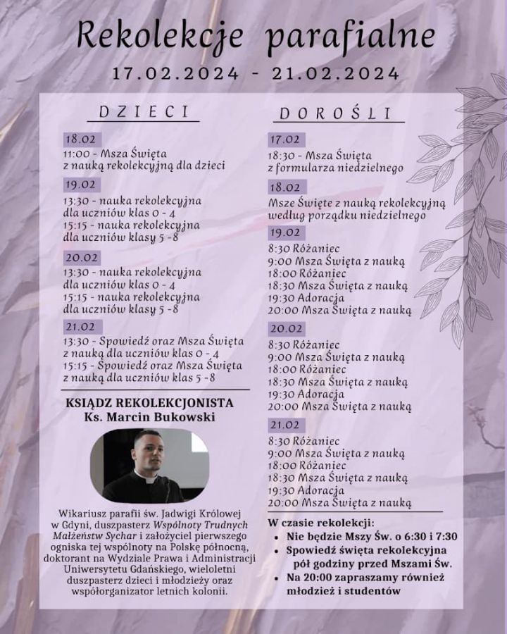 Rekolekcje dla dorosłych, młodzieży i dzieci poprowadzi ks. Marcin Bukowski, wikariusz parafii św. Jadwigi Królowej w Gdyni, znany części naszych dzieci z letnich kolonii, które prowadzi z ks. Wojciechem.