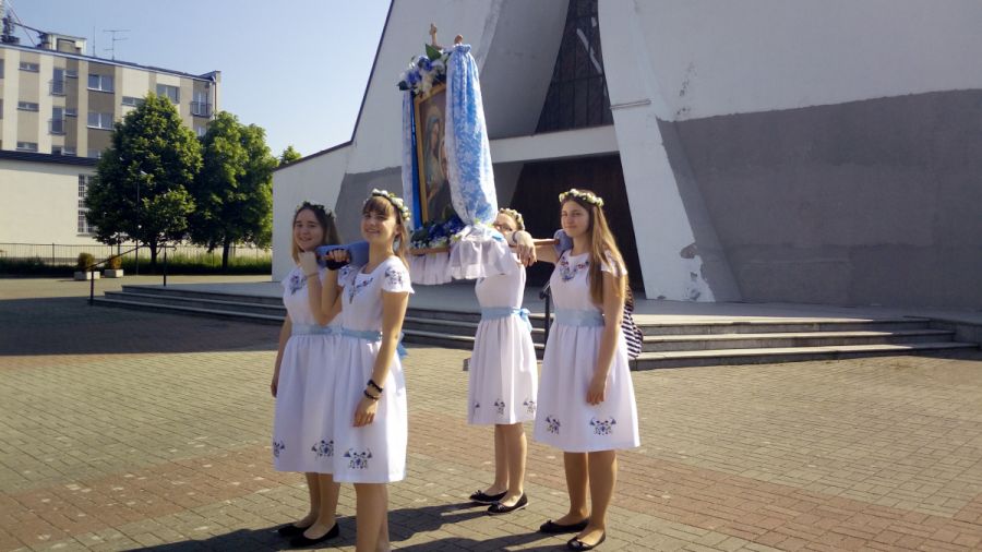 Naszą parafię reprezentuje "damski" obraz św. Maksymiliana Kolbe (20 kg), "męska" ikona Matki Boskiej Częstochowskiej (40 kg) oraz figura Królowej Polski (80 kg). Młodzież nosząca feretrony ma własny, niepowtarzalny strój, który ma znaczenie symboliczne. Przy pierwszym z wymienionych, dziewczęta charakteryzują się białymi sukniami z haftowanym wzorem kaszubskim przepasanymi niebieską wstążką oraz białymi wiankami (symbol czystości) na głowach (zob. zdjęcie). Chłopcy natomiast ubrani są w białe koszule, czarne spodnie oraz niebieskie (kolor Maryjny) krawaty. Młodzież przy figurze Królowej Polski cechują niebieskie sukienki, a na ich szyi można zauważyć cudowne medaliki.
